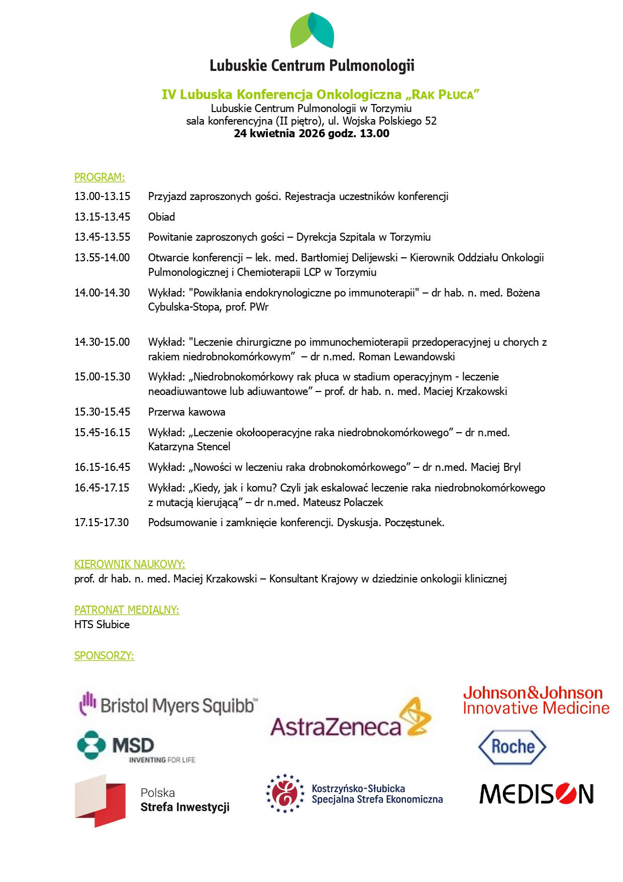 Już 24 kwietnia 2026 r. o godz. 13:00 w Lubuskim Centrum Pulmonologii w Torzymiu odbędzie się wyjątkowe wydarzenie naukowe poświęcone najnowszym wyzwaniom i metodom leczenia raka płuca.
